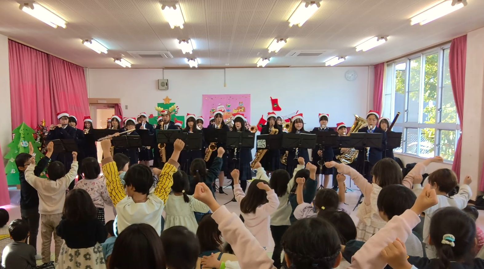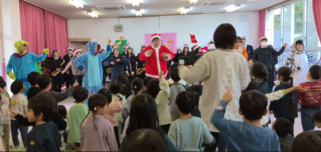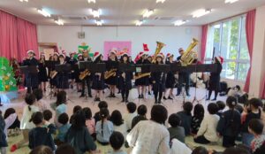 12月19日(金)に生徒会執行部5名と吹奏楽部約30名、教職員5名で江南市立中央保育園を訪れ、クリスマスコンサートを開催しました。