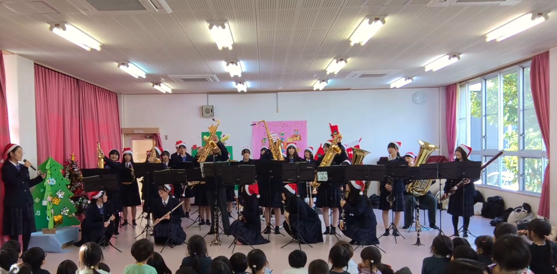 最初に生徒会執行部が「からだ☆ダンダン」を踊り、その後吹奏楽部が「クリスマスメドレー」、「鬼のパンツ」、「楽器紹介&スタジオジブリ曲」、「マツケンサンバ」を披露しました。