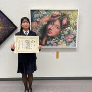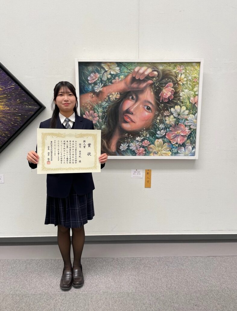 愛知県文連美術展 新人賞受賞! 2026年1月27日/カテゴリ: 美術, 部活動 /作成者: 江南高校第50回愛知県文連美術展にて、美術部1年生の図司実早紀さんが新人賞を受賞しました。 新人賞は30歳未満を対象として、優れた作品に授与されます。 1月25日(日)に表彰式が行われました。 図司さんコメント「(表彰式は)緊張したけど、頑張って良かったです。本当に感謝です。期待に応えられるよう、これからも頑張ります!」 愛知県文連美術展目録R8/1/26 https://ko-nan.jp/wp-content/uploads/2026/01/図司表彰R8/1/26.jpg 1416 1080 江南高校 https://ko-nan.jp/wp-content/uploads/2018/01/logo.png 江南高校2026-01-27 12:00:452026-01-27 12:00:45愛知県文連美術展 新人賞受賞!