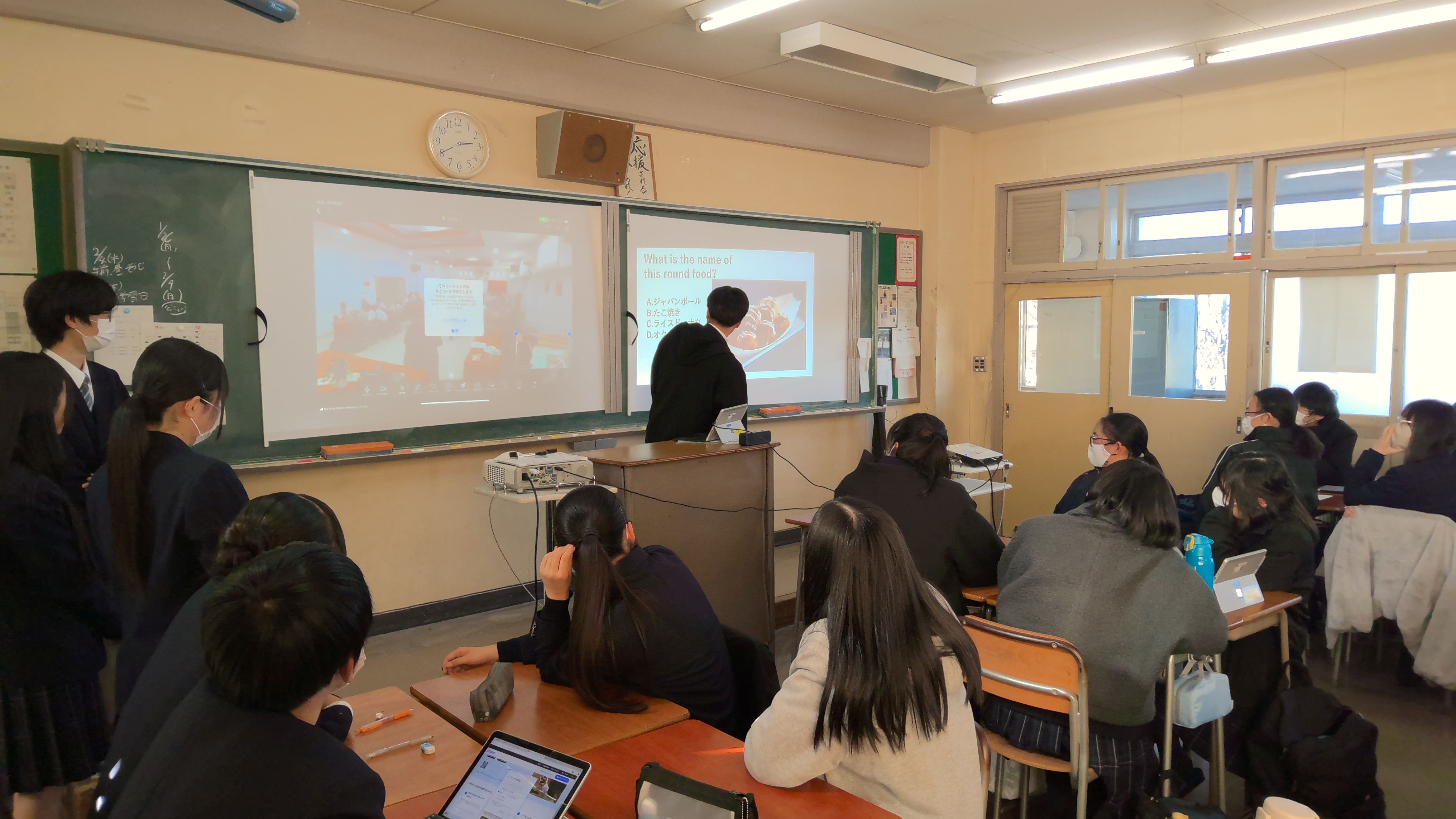 現地との時差1時間しかないため、zoomで現地と授業を繋ぎ、リアルタイムで交流することができました。前半は日本の高校生が各グループのテーマに沿って日本の文化を英語でプレゼンをおこないました。